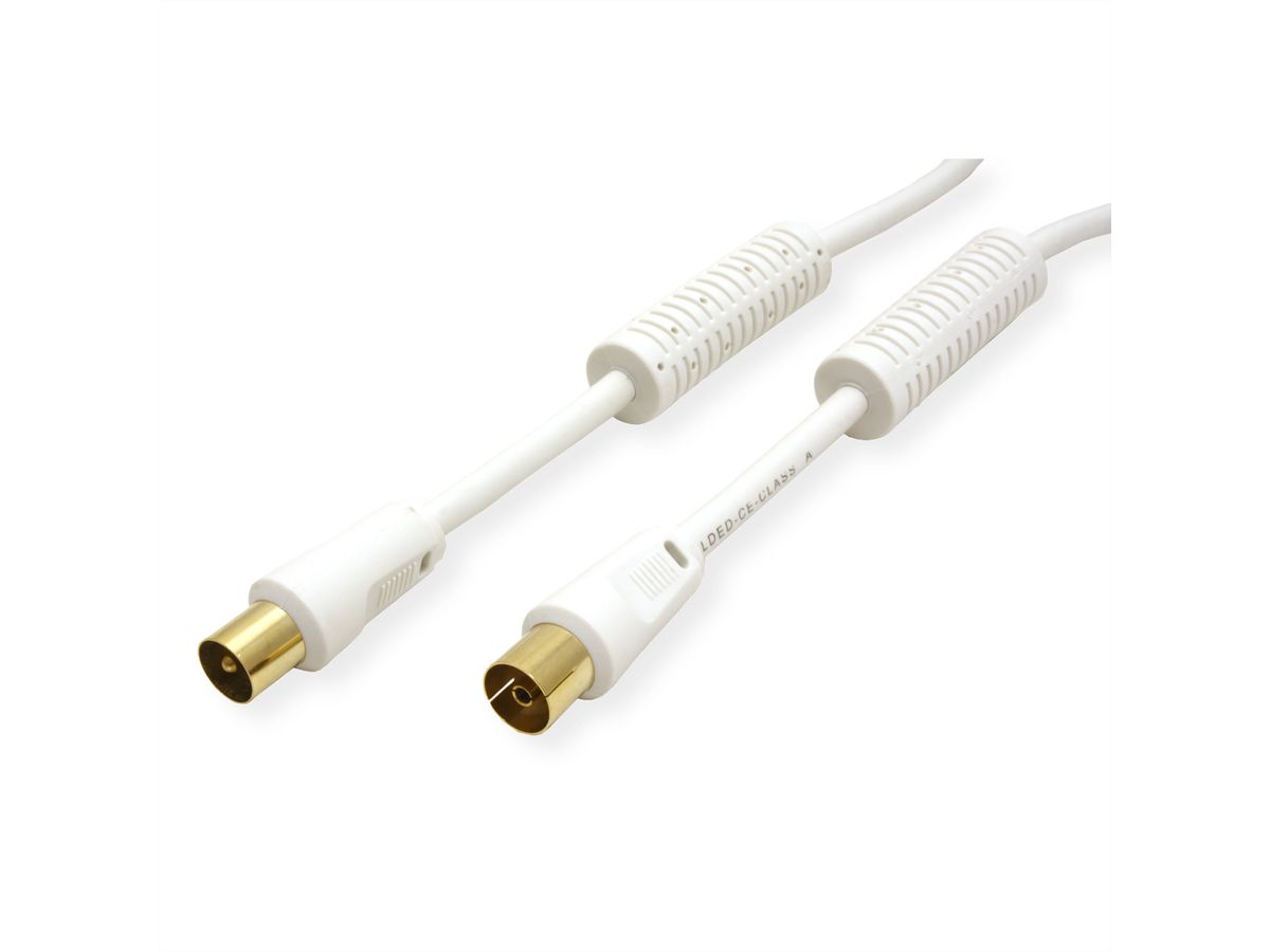 Doppelt geschirmtes Koaxialkabel mit Koaxialstecker und Koaxialkupplung zur Verwendung als TV Antennenkabel.