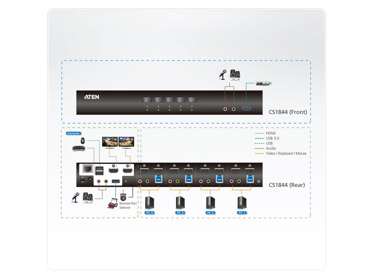 ATEN CS1844 4-Port True 4K HDMI Dual-View KVM Switch mit Audio & USB 3.0Hub