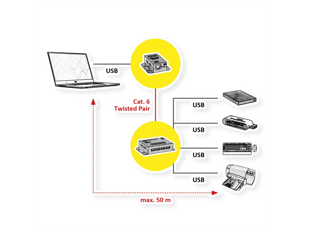 ROLINE USB 2.0 Extender over RJ-45, PoC, 4x USB, max. 50m