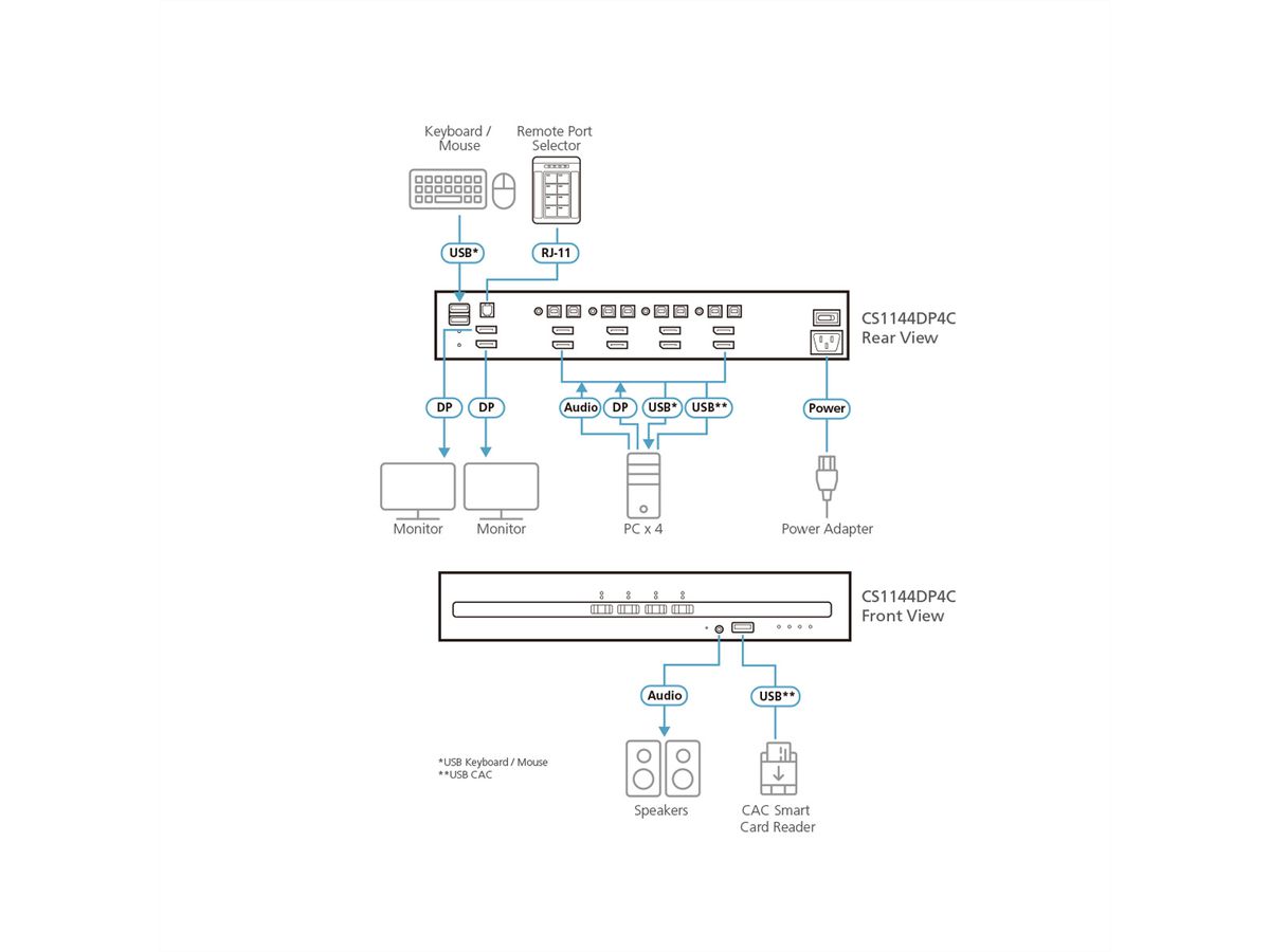 | Leveringsomvang | 1x CS1144DP4C 4-poorts USB DisplayPort Dual Display Secure KVM switch met CAC, 1x voedingsadapter, 1x gebruiksaanwijzing |