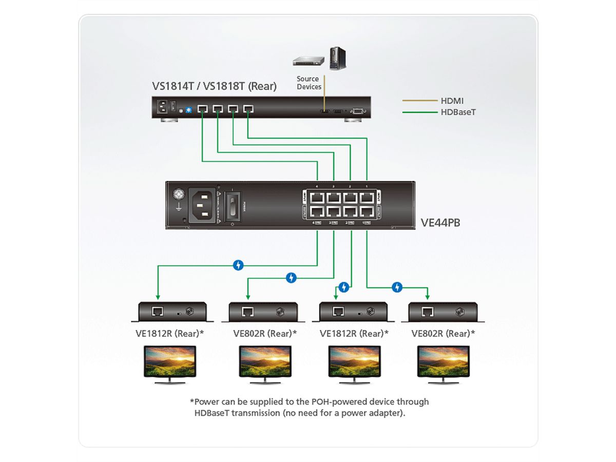 • Levert stroom voor maximaal vier ATEN Power-over-HDBaseT (PoH)/Power-over-Ethernet (PoE)-compatibele producten via Cat 5e/6/6a-kabels