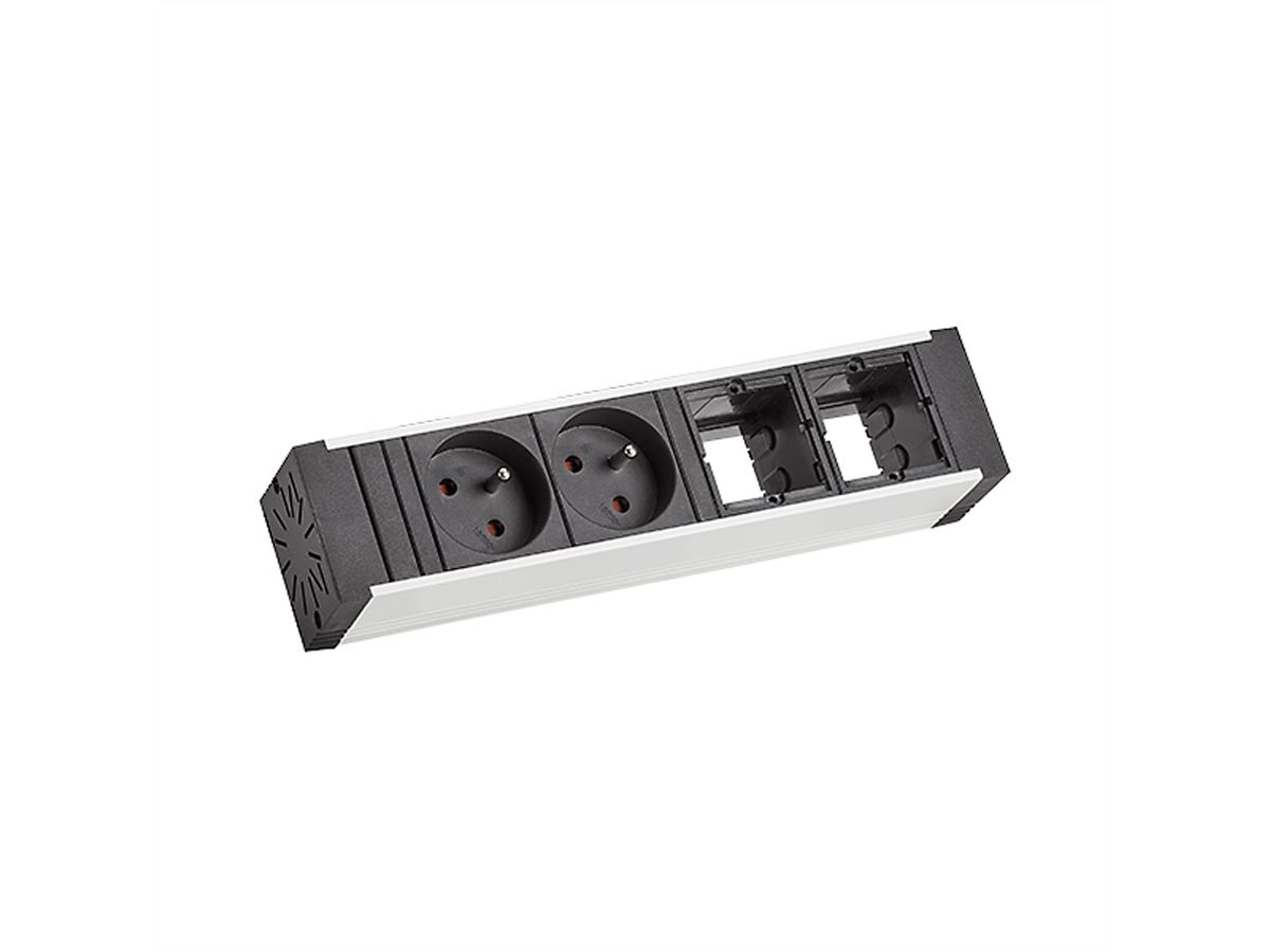 VENID ALU stekkerdoos met verbeterde aanrakingsbeveiliging Lengte: ca. 229 mm, 4-voudig, 2xUTE France contactdozen zwart, 35° gedraaid, met verbeterde aanrakingsbeveiliging, 2x speciale modules leeg Kabel: 0,2m H05VV-F 3G1,5mm² zwart met GST18 stekker incl. montagebeugel verpakt in kartonnen doos.