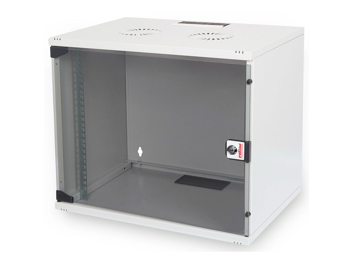 De 19" wandkasten uit de ROLINE Basic serie worden ongemonteerd als bouwpakket geleverd. Ze zijn verkrijgbaar in vier verschillende hoogte-eenheden en voorzien van een volledig glazen deur en kabelingangen met borstels aan de boven- en onderkant, en zijn ideaal voor subdistributie of voor het opzetten van een klein tot middelgroot netwerk. Binnenin zijn een paar gegalvaniseerde 19" profielrails met afleesbare hoogte-eenheden geïnstalleerd, die in diepte verstelbaar zijn. Elke behuizing bestaat uit een stevige stalen constructie van maximaal 1,5 mm dik plaatstaal en is verkrijgbaar met elektrostatische poedercoating in de standaardkleuren grijs (RAL 7035) en zwart (RAL 9005). Het deurscharnier kan indien nodig worden vervangen. De montage is snel en eenvoudig dankzij de bijgeleverde montagehandleiding.