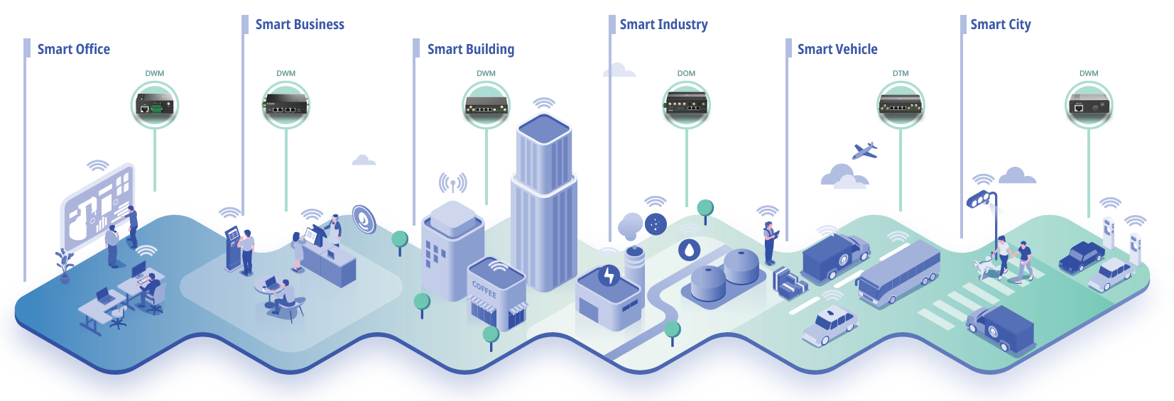 De DWM-serie biedt betrouwbare, veilige verbindingen voor slimme zakelijke toepassingen, de DOM-serie biedt verschillende interfaces voor de integratie van IoT-apparaten in slimme industriële omgevingen en de DTM-serie biedt realtime locatietracking en EN 50155-certificering voor inbouw in slimme voertuigtoepassingen.